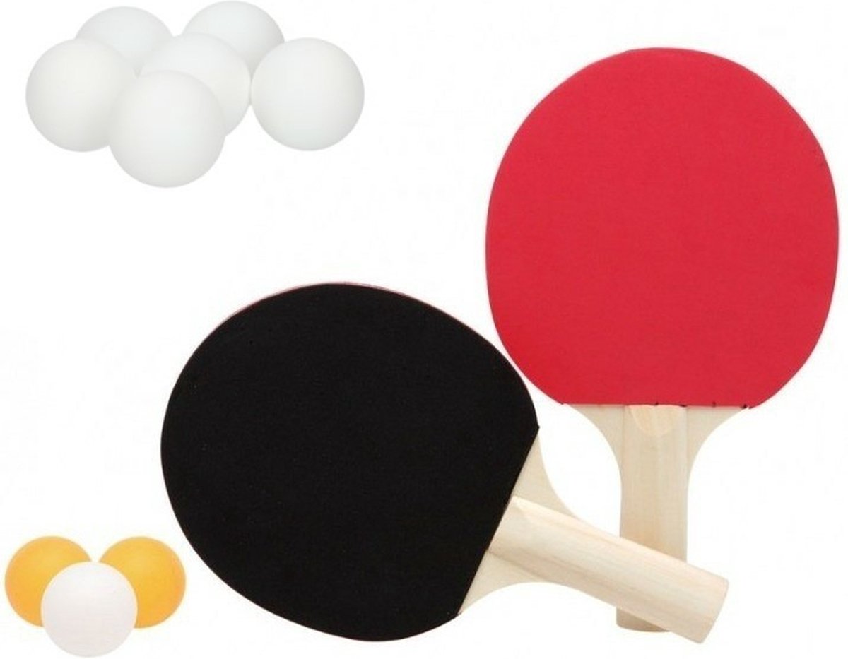 Tafeltennis of ping pong setje van 2 batjes en 9x tafeltennisballetjes. De batjes zijn glad en hebben geen ribbeltjes.